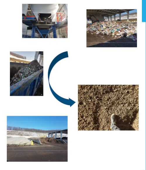 (4) In der Fraktion < 80 mm ist die Organik enthalten, die es abzubauen gilt, bevor das Material auf der Deponie abgelagert wird. Dies verhindert eine Gasentstehung im Deponiekörper und verringert somit die Operationskosten der Deponie sehr stark. Die biologische Stabilisierung ist in zwei Phasen à 3 Wochen aufgeteilt und es entstehen ein Kompost ähnliches Produkt, dass je nach Gesetzeslage in die Landwirtschaft abgegeben warden darf, und eine Fraktion mit Plastik und weiteren nicht organischen Stoffen