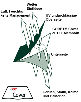 Beim Einsatz dieses Systems wird eine hochfunktionelle Abdeckung über die Miete gezogen: ein dreischichtiges Laminat, bestehend aus zwei hochwertigen, UV-stabilen Textilgeweben und einer wasserdichten und atmungsaktiven semipermeablen Membran (GORE© Cover).