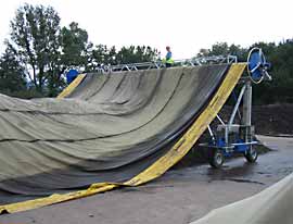 Das Aufwickeln der Plane erfolgt direkt durch das Gerät, das Abwickeln bzw. Abdecken über ein Drahtseil und Radlader.