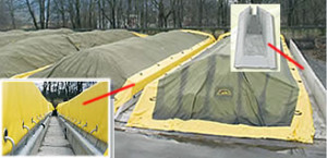 Über Rottemodule zur Befestigung der Plane an den Seitenwänden und durch Planenwickelgeräte (siehe unten) lässt sich die GORE© Cover Membran sehr einfach über die Miete ausbreiten und wieder entfernen, etwa zum Umsetzen.